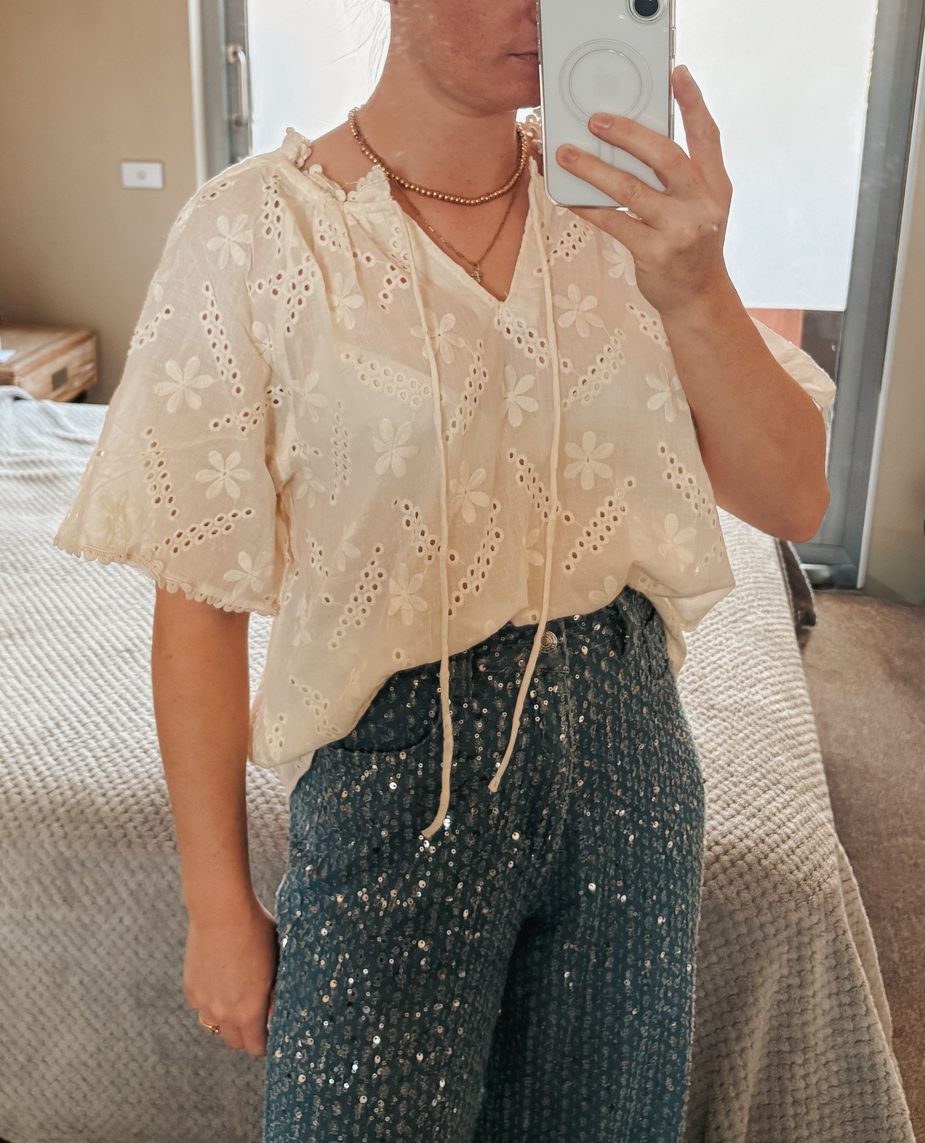 A timeless ode to French charm, the Melissa blouse brings together delicate lace, textured cotton, and just the right volume — all in one effortlessly elegant piece.