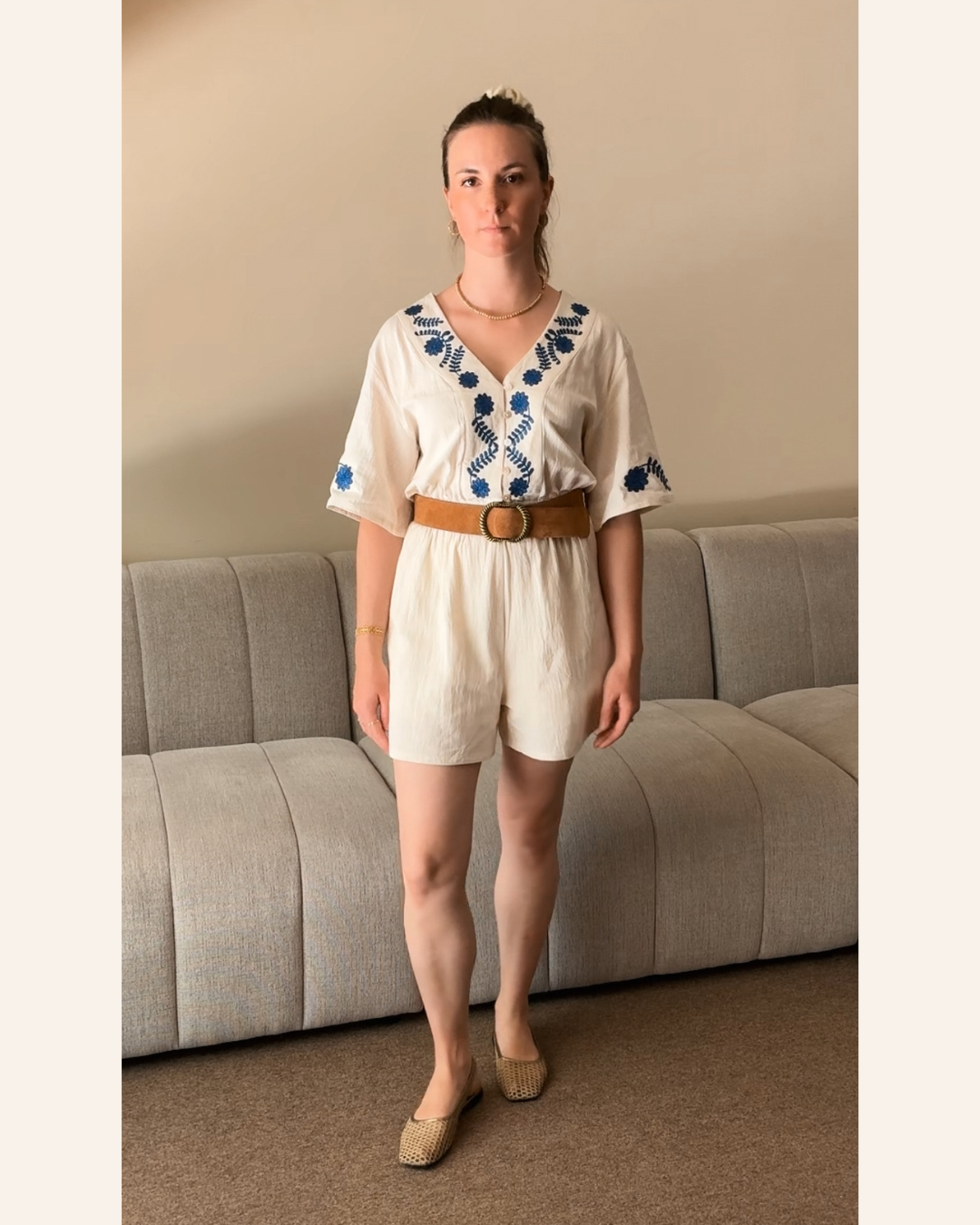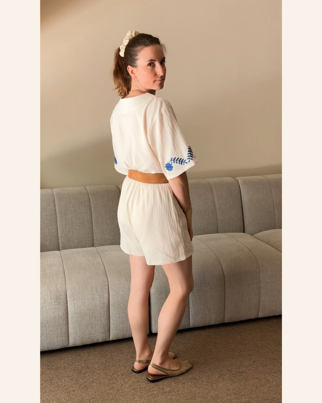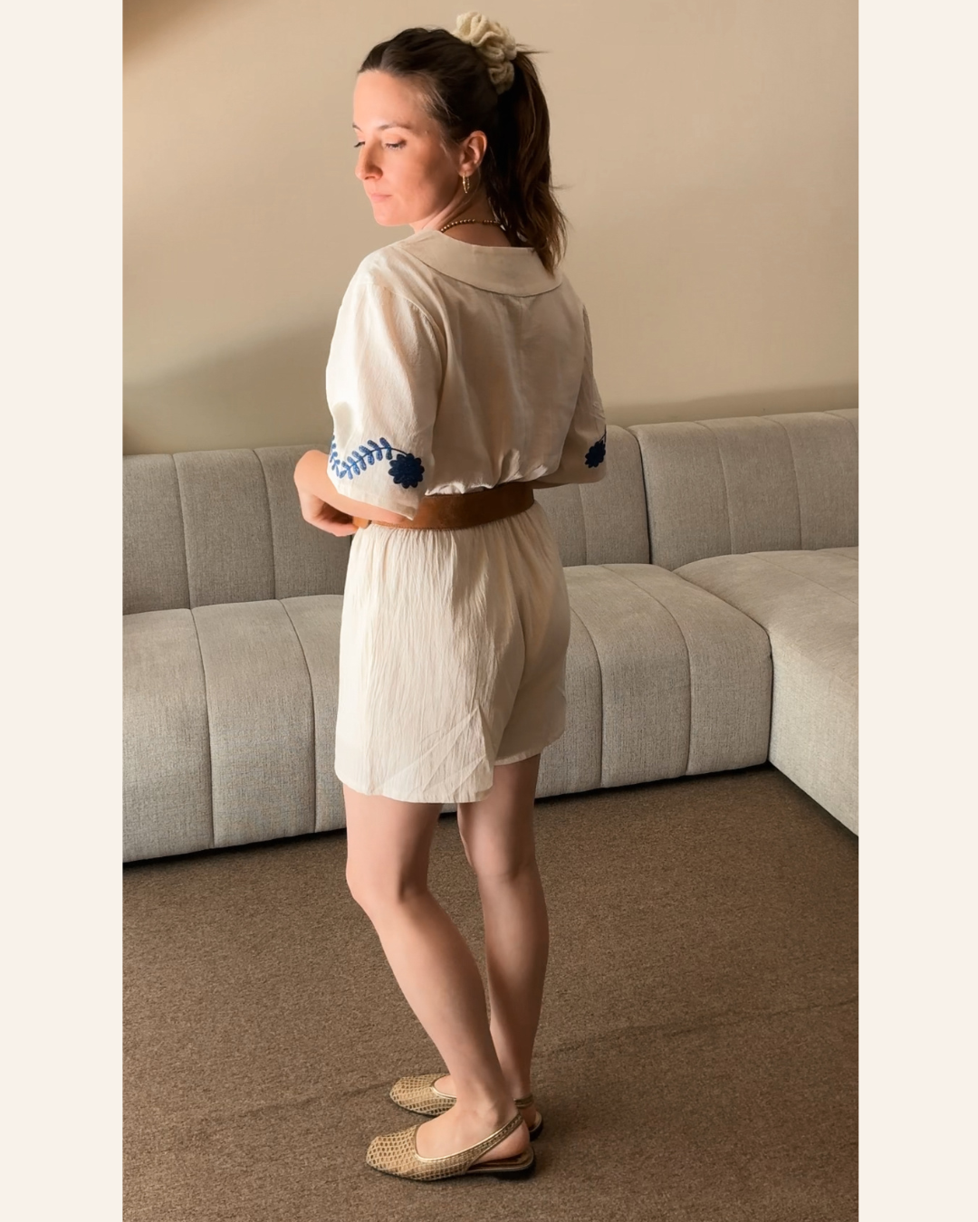 Crafted in light beige cotton, it’s designed with a flattering elasticated waist that gives freedom to move. The eye-hole button-down front, short sleeves, and feminine embroidery offer just enough polish to feel put-together — without overthinking it.