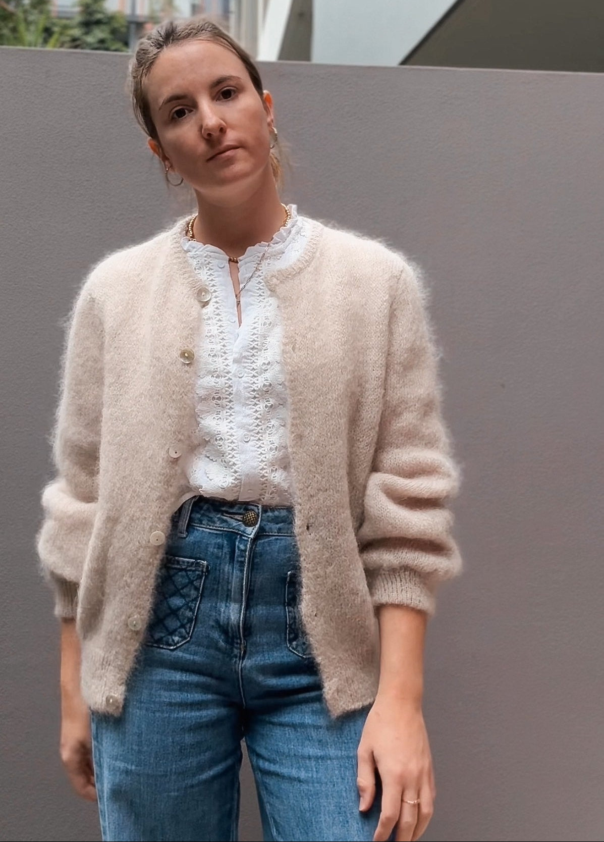 The Maude Cardigan in a Taupe Mohair Wool — where softness meets quiet elegance.
